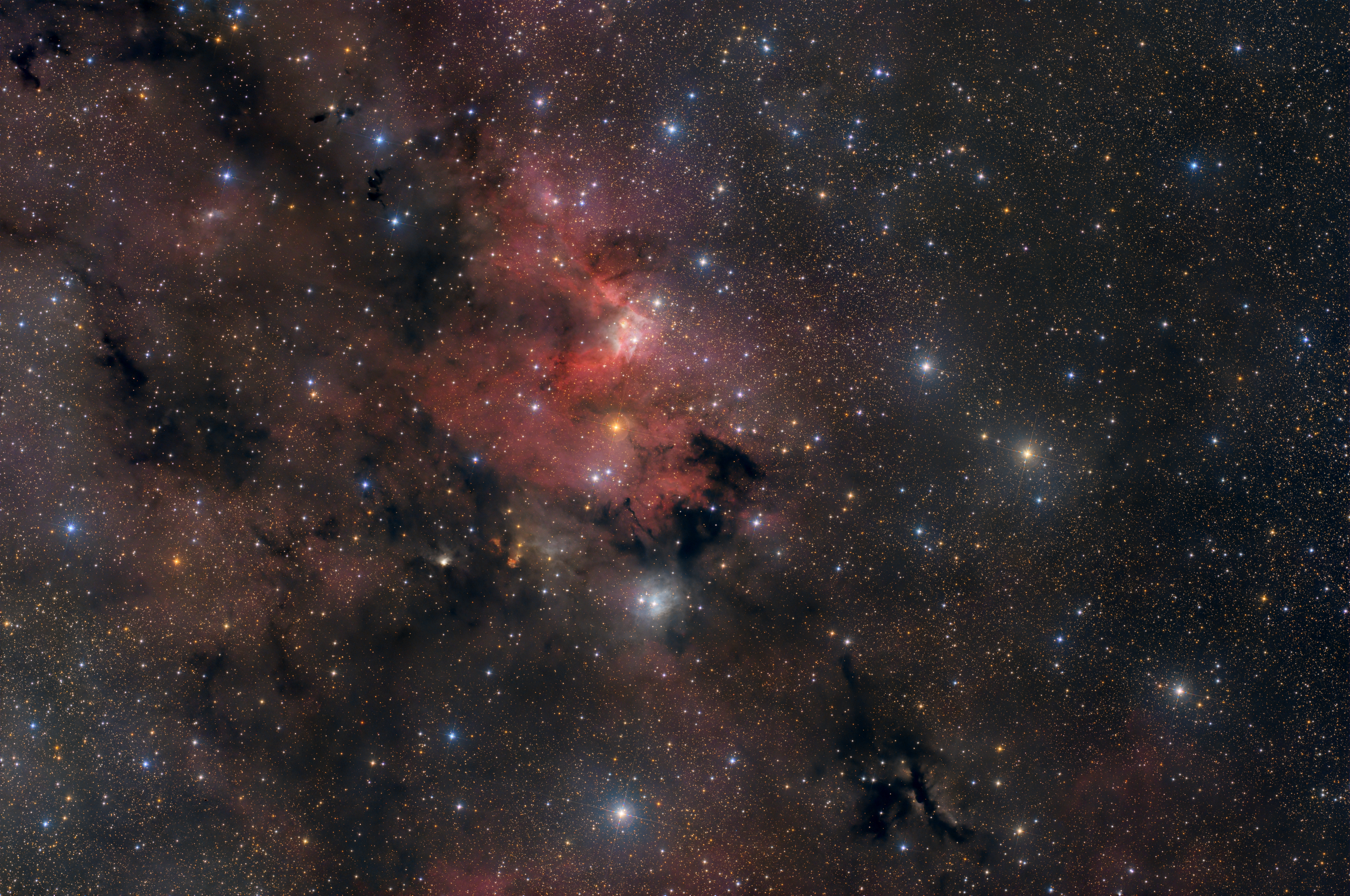 Der Cave-Nebel (auch bekannt als Sharpless 2-155 oder Sh2-155) ist eine H-II-Region, also eine Wolke aus ionisiertem Gas, in der neue Sterne entstehen. Er befindet sich im Sternbild Kepheus. Diese Region ist etwa 2400 Lichtjahre von der Erde entfernt und liegt in einer großen Sternentstehungsregion, die auch als Cepheus B bekannt ist. Der Cave-Nebel hat seinen Namen aufgrund seines visuellen Erscheinungsbildes, das in Teleskopaufnahmen wie der Eingang zu einer Höhle aussieht. Der Nebel ist eine Mischung aus Emissions-, Reflexions- und Dunkelnebeln und enthält viele junge Sterne, die in der Wolke aus Gas und Staub geboren werden.