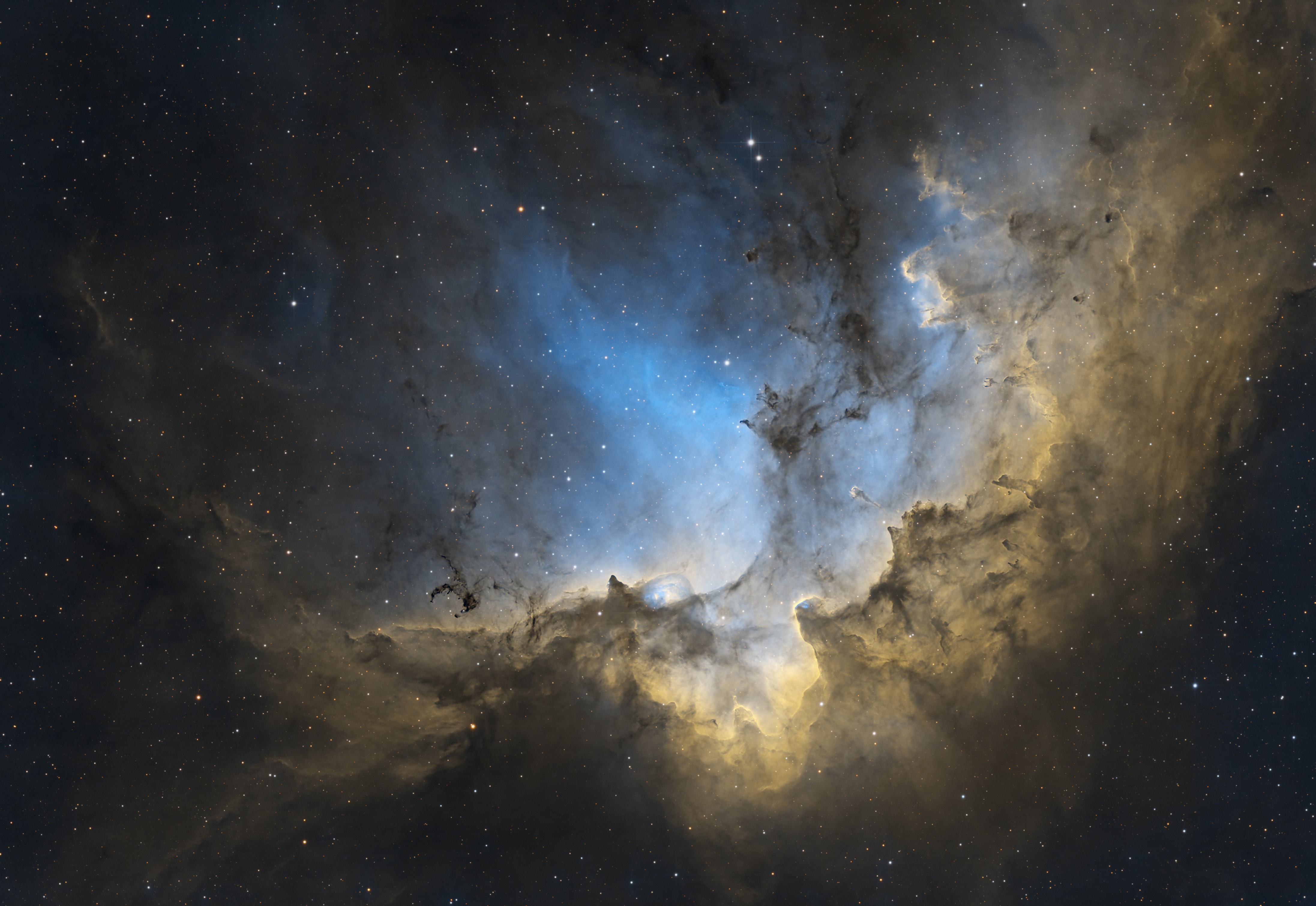 Der Nebel NGC 7380, auch bekannt als "Zauberernebel" oder "Wizard Nebula," ist ein Emissionsnebel im Sternbild Kepheus, etwa 7.200 Lichtjahre von der Erde entfernt. Der Nebel ist eine aktive Sternentstehungsregion. Die neu entstandenen Sterne erzeugen viel ultraviolettes Licht, das das umgebende Gas ionisiert und so zum Leuchten bringt. Der Sternenhaufen in NGC 7380 ist mit 4 bis 5 Millionen Jahren relativ jung. Die massereichen Sterne im Inneren des Nebels, insbesondere der heißeste und hellste davon, stoßen starke Sternenwinde und intensive Strahlung aus. Diese Phänomene schaffen dynamische Gaswolken, die Formen wie Bögen, Säulen und filamentartige Strukturen bilden. Solche Prozesse machen NGC 7380 zu einem Paradebeispiel für die Auswirkungen massereicher Sterne auf ihre Umgebung. Die Interaktion von Strahlung und Materie in solchen Nebeln liefert Einblicke in die Entwicklung von Sternhaufen und die Bedingungen, die zur Bildung von Sternen führen.