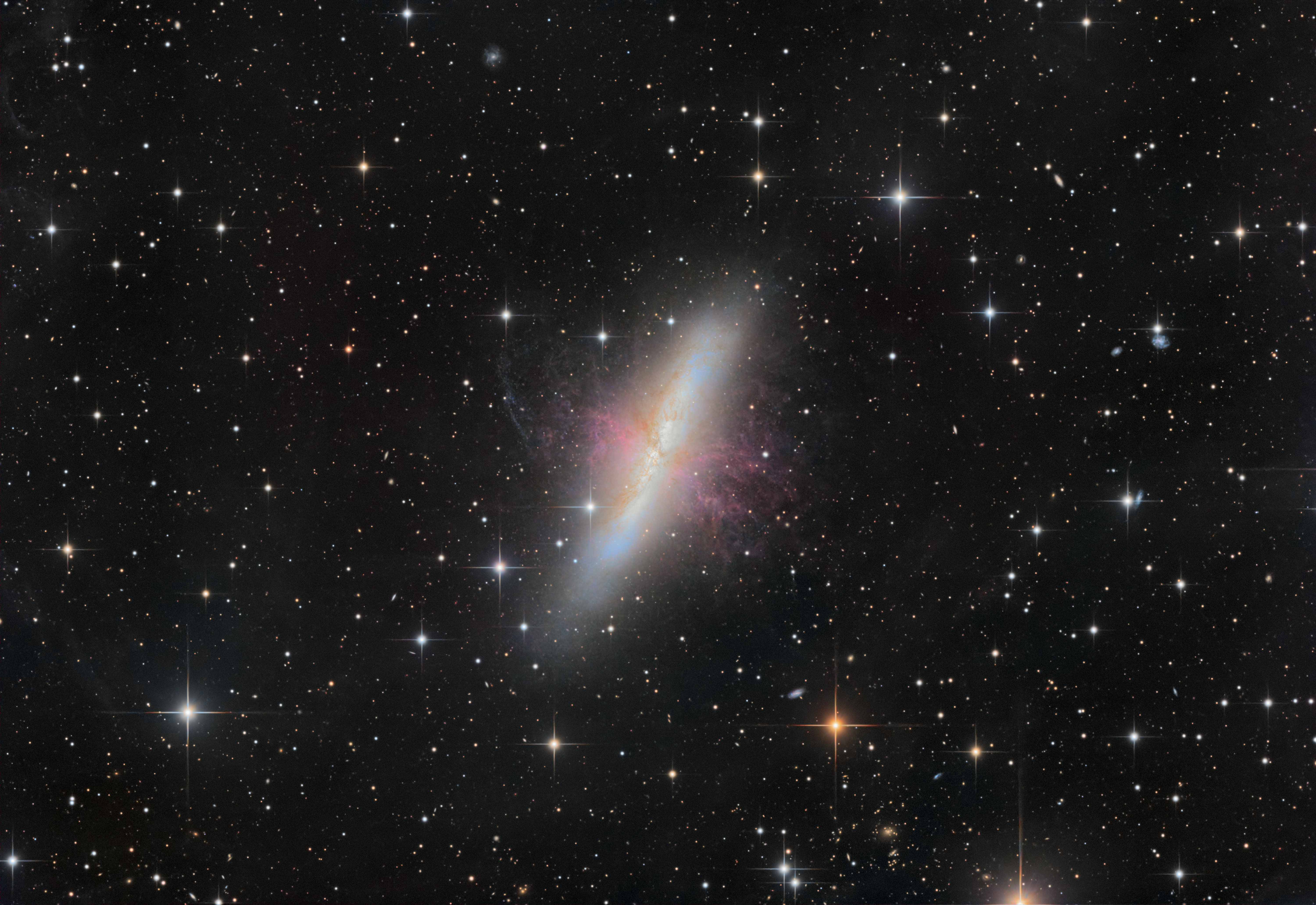M82, auch bekannt als die Zigarren-Galaxie, ist eine spiralförmige Galaxie im Sternbild Große Bärin (Ursa Major). Sie zeichnet sich durch ihre zylindrische Form aus, die sich von der typischen spiralförmigen Struktur anderer Galaxien unterscheidet. Diese Anomalie hat ihr den Spitznamen „Zigarren-Galaxie“ eingebracht. M82 befindet sich etwa 12 Millionen Lichtjahre von der Erde entfernt und ist Teil einer Wechselwirkung mit der benachbarten Galaxie M81. Diese gravitativen Wechselwirkungen sind für die intensive Sternentstehung verantwortlich, die in M82 stattfindet, insbesondere im zentralen Bereich der Galaxie, wo zahlreiche aktive Regionen beobachtet werden können. Zusätzlich ist M82 eine der hellsten Galaxien im Radiobereich, und es ist bekannt, dass sie bedeutende galaktische Jets aus ihrer zentralen Region ausstößt.